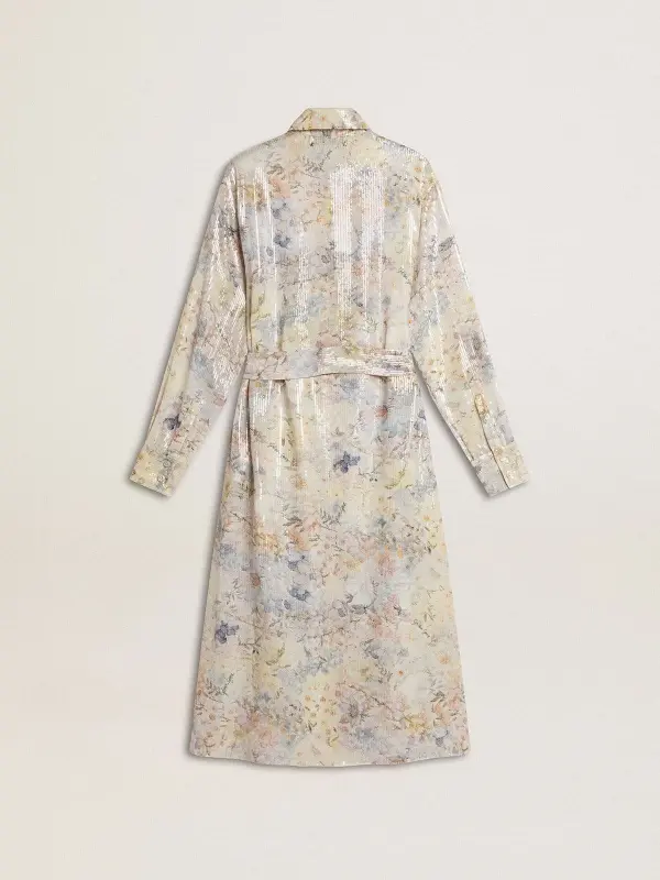 Inspired by the iconic Seventies, the carefree spirit of that era comes to life with the first drop of our Fall/Winter 25 collection. This shirt dress features a multicolor floral sequin print in shades of lilac, yellow and pastel blue. The tone-on-tone belt and button fastening add the finishing touch.