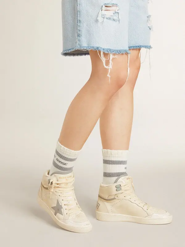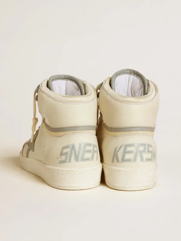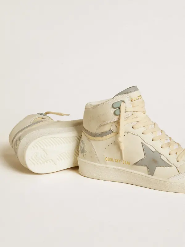 A reinterpretation of high-top sneakers with an authentic soul: inspired by our Ball Star model, our Sky-Star sneakers have an American college vibe and a feel of the basketball scene of the Eighties. This women's model with a white leather upper features a powder blue leather star and a white leather heel tab, and the Golden Goose signature on the neck of the ankle, a reference to the childhood dream of having your favorite sneakers signed by basketball legends. The white crackle leather toe, white mesh tongue and beige laces complete the look.