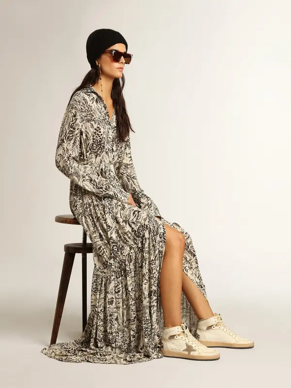 A reinterpretation of high-top sneakers with an authentic soul: inspired by our Ball Star model, our Sky-Star sneakers have an American college vibe and a feel of the basketball scene of the Eighties. This women’s model, with a yellowed-effect white nappa leather upper, features a dove-gray suede star and the Golden Goose signature on the neck of the ankle, a reference to the childhood dream of having your favorite sneakers signed by basketball legends. The beige nylon tongue and beige laces complete the look.