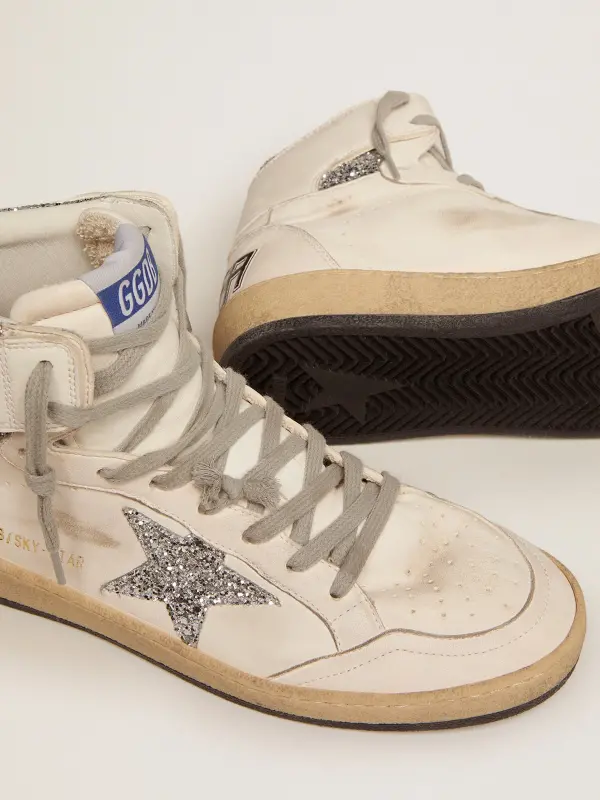 A reinterpretation of high-top sneakers with an authentic soul: inspired by our Ball Star model, our Sky-Star sneakers have an American college vibe and a feel of the basketball scene of the Eighties. Made of white nappa leather with silver glitter inserts, they feature the Golden Goose signature on the neck of the ankle, a reference to the childhood dream of having your favorite sneakers signed by basketball legends.