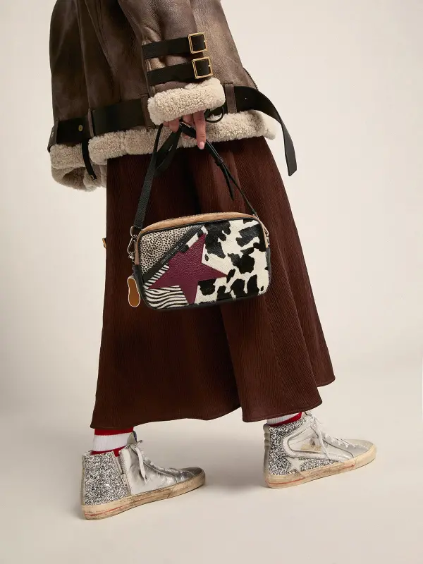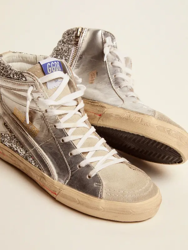 Skate soul, glamorous attitude. Our Slide sneakers take you straight to Venice Beach, between an ollie and a kickflip. These sneakers feature an upper in laminated leather and glitter upper, both silver. The white leather star adds the finishing touch.