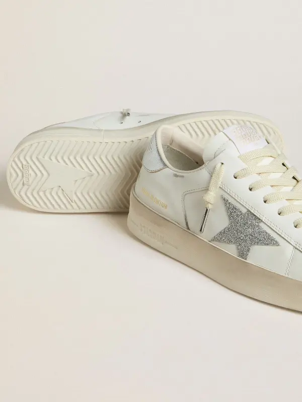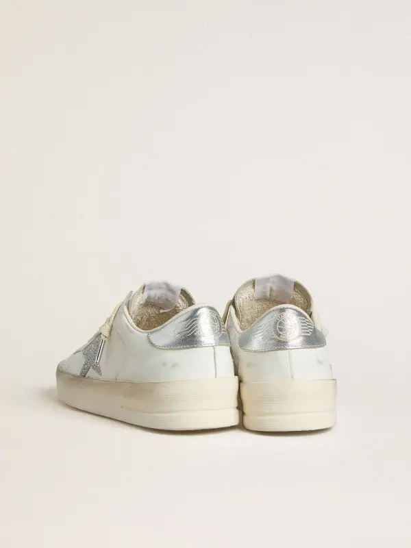 The glorious Nineties wrapped up in a sneaker. The Stardan sneakers pay homage to the basketball icons of that decade, while keeping an eye on the present. This women's version with a white leather upper features a silver micro-crystal Swarovski star and a silver metallic leather heel tab. And cream-colored laces add the finishing touch.