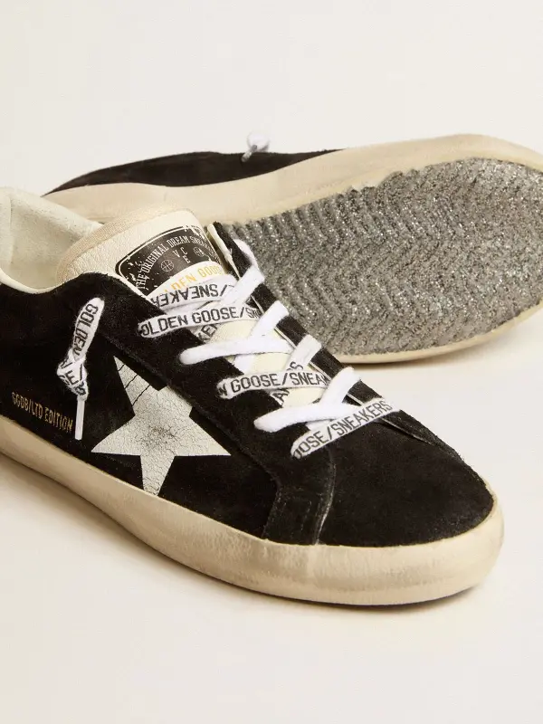 A timeless icon yet one that’s constantly evolving. At Golden, we love taking our classics and reworking them all the time, always from a new angle. These women's Super-Star with a black suede upper feature a white printed star with a crackle effect and a silver glitter heel tab. The white nappa leather tongue and white laces with contrasting black logo complete the look.