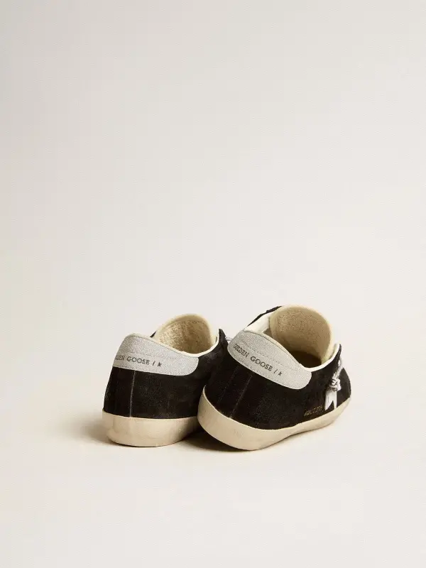 Women’s Super-Star LTD in black suede with white printed star and silver glitter heel tab