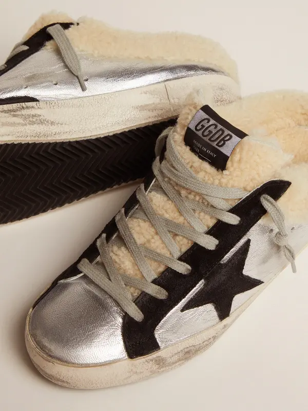 Our iconic sneakers in the new sabot version: lined with soft shearling, these Super-Star sneakers feature a silver laminated leather upper embellished with a black suede star and inserts. The beige shearling tongue and ice-gray laces complete the look.