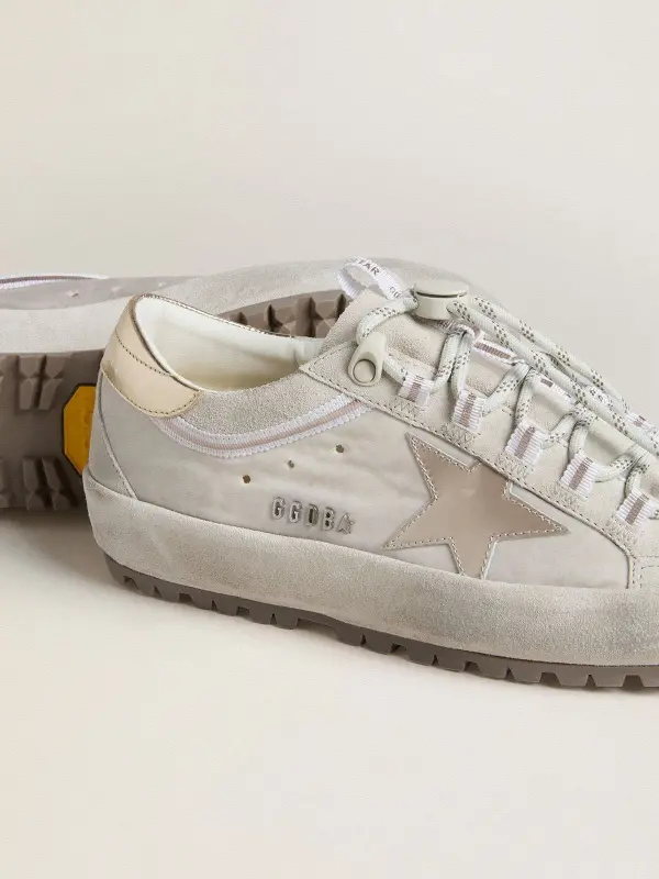 A timeless icon yet one that’s constantly evolving. At Golden, we love taking our classics and reworking them all the time, always from a new angle. These women's Ski Super-Star with a light gray nylon upper feature a silver metallic leather star, a platinum metallic leather heel tab and white suede inserts. Hiking-style laces with adjustable stopper, both white, add the finishing touch.