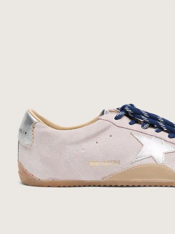 Rooted in '60s running heritage, the True-Star brings retro style and timeless performance back to the track. This women's model with a soft pastel pink suede upper features a white toe cap, a silver foiled leather star and a dark gray leather insert on the back.The silver foiled leather heel tab and two-tone blue and white hiking laces add the finishing touch.