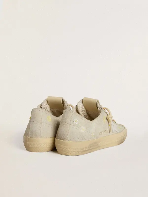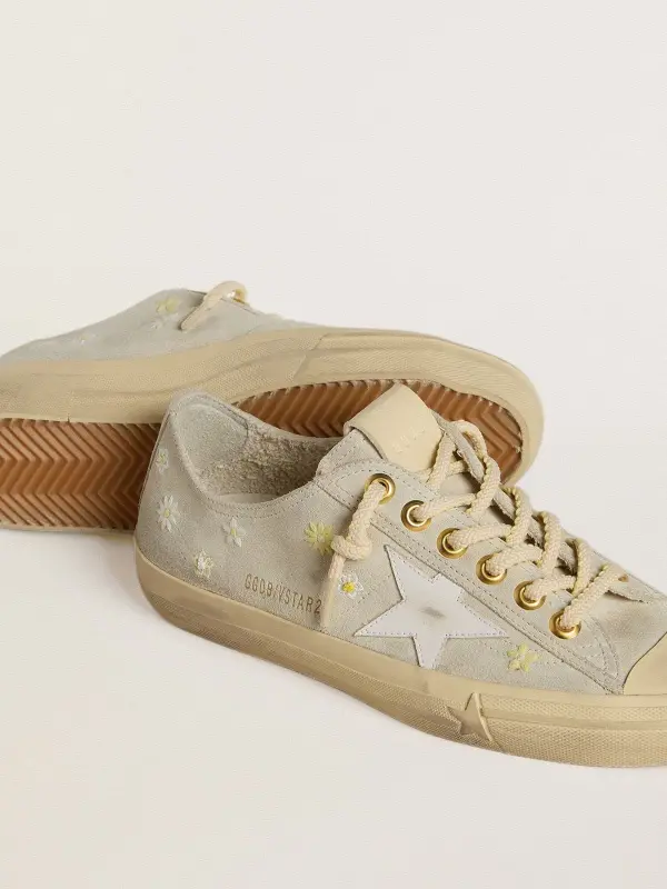 Women’s V-Star in ice-gray suede with white leather star and floral embroidery