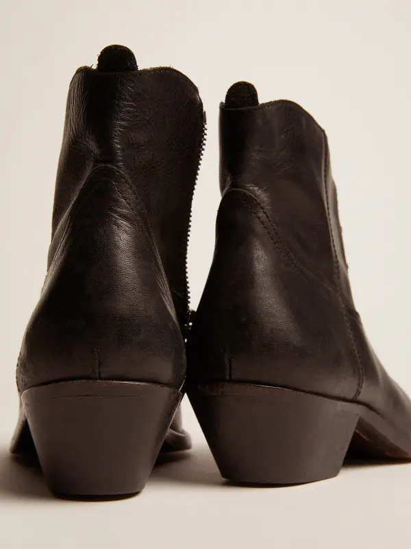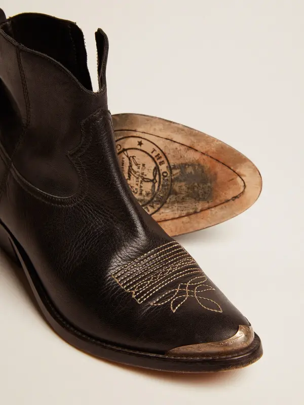 Young boots are a contemporary reinterpretation of the classic cowboy boot, feminized by the softened lines and high heel. Hand-crafted in leather decorated with cowboy-style sand-colored stitching, this model features a black leather upper and a toe in aged-effect silver-colored metal. The zip fastening on the side and gold-colored metal plaque engraved with the Golden Goose signature on the heel complete the look.