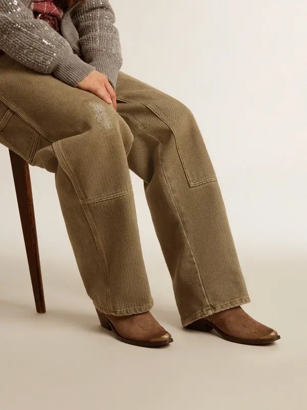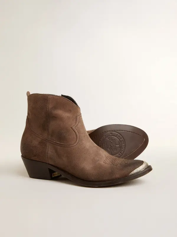 Young boots are a contemporary reinterpretation of the classic cowboy boot, feminized by the softened lines and high heel. Hand-crafted in leather decorated with cowboy-style stitching, this model features a dark brown suede upper and a toe in aged-effect silver-colored metal. The zip fastening on the side and gold-colored metal plaque engraved with the Golden Goose signature on the heel complete the look.
