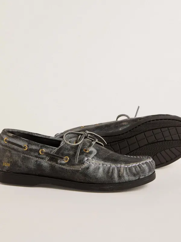 This Young boat shoe features a black distressed leather upper and a classic cord with golden eyelets. The distressed-effect black laces with gold-colored metallic accents complete the look.