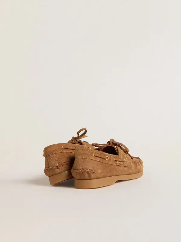 This Young boat shoe features a light brown suede upper and a classic cord with golden eyelets. The light brown laces with gold-colored metallic accents complete the look.