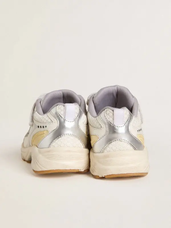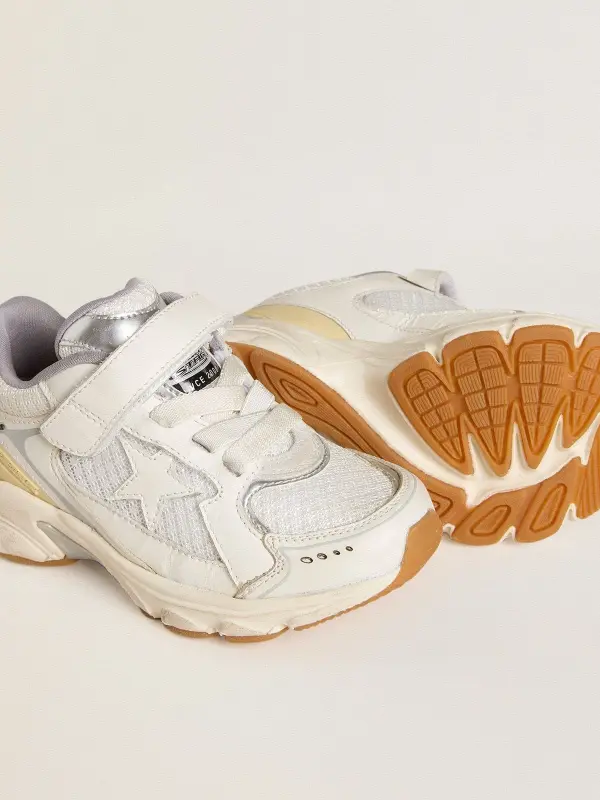 A flashy memory of Y2K. Lightstar is a symbol of nostalgia with a future-forward touch. With metallic flairs and a chunky sole, the Young version of this model is always in the spotlight. This model with a white leather and mesh upper features a white leather star and white laces. This model is embellished with details that complete the look: metallic leather inserts, logo label on the tongue, and mesh textures.