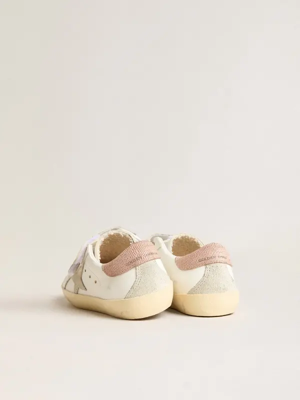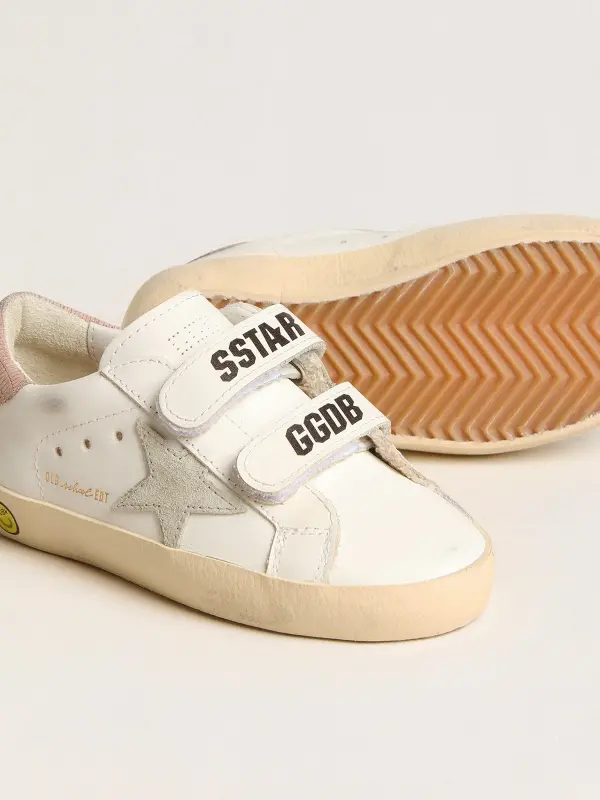 Our Old School sneakers feature two Velcro straps on the front with contrasting logo. With a white leather upper, the Young version of this model features a gray suede star and old-rose hammered leather heel tab. The smiley detail on the foxing adds the finishing touch.