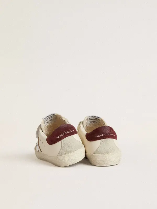 Our Old School sneakers feature two Velcro straps on the front with contrasting logo. With a white leather upper, the Young version of this model features a silver metallic leather star, a purple suede heel tab and ice-gray suede inserts. The smiley detail and contrasting lettering on the foxing add the finishing touch.