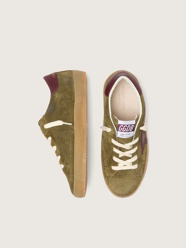 Young Super-Star in military-green suede with burgundy leather star and heel tab